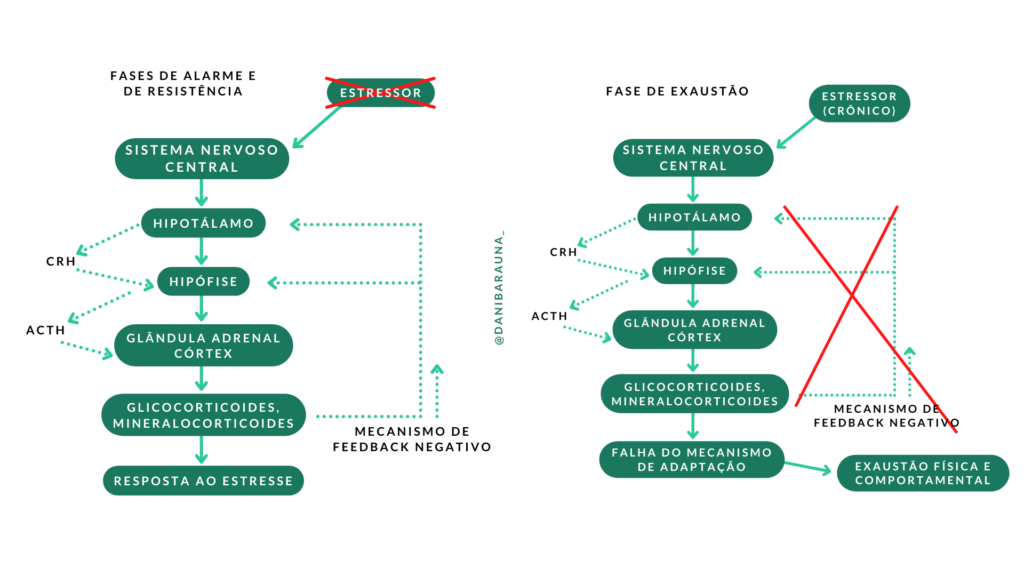 O estresse, ao contrário da homeostasia, é o estado do organismo no qual, após a ação de agentes de qualquer natureza, responde com uma série de reações não específicas de adoração. É dividido em eustress (uma resposta positiva do indivíduo, praticamente momentânea) e distress (perdura mais que o necessário, trazendo malefícios à saúde do indivíduo).